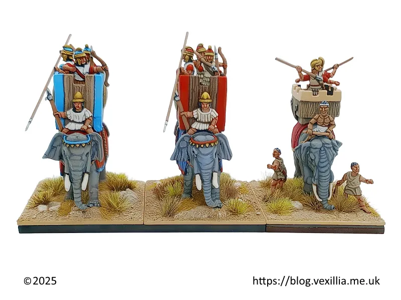 Finally, here's a comparison of the Essex and Donnington elephants I painted in January. The beasts aren't that different in size, but the howdahs are noticeably different in both height and style.